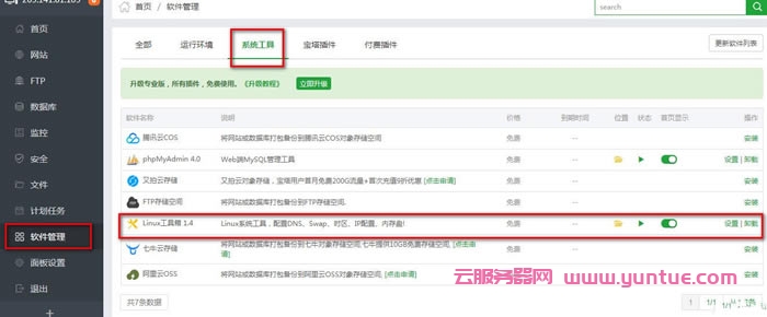 登錄寶塔面板,在左側(cè)”軟件管理”里的”系統(tǒng)工具”找到”linux工具箱1.4″,如果沒(méi)有安裝,安裝下免費(fèi)插件,官方的放心使用。