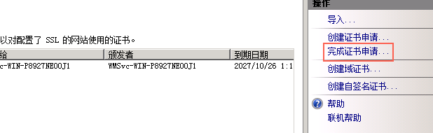 雙擊打開服務(wù)器證書后,點(diǎn)擊右則的完成證書申請