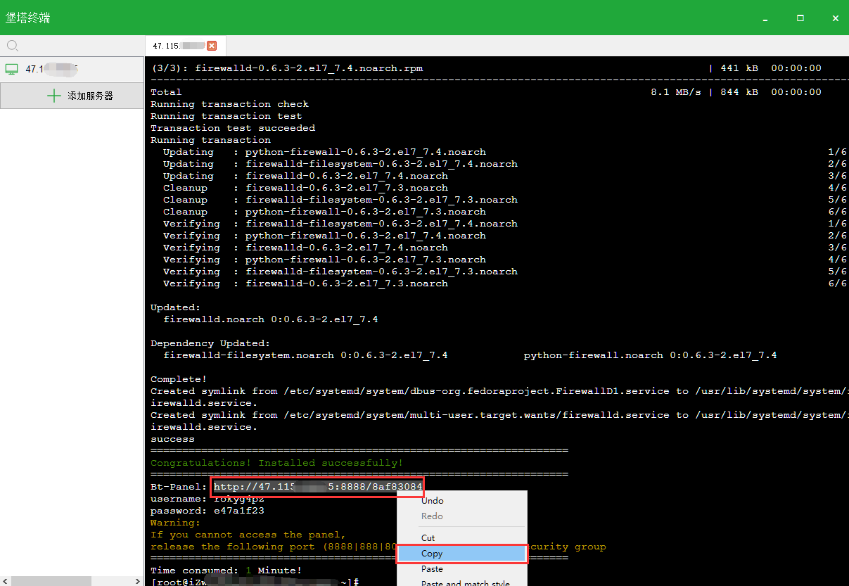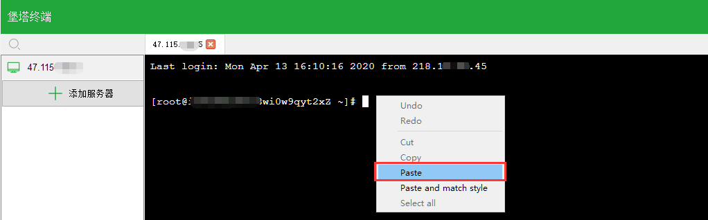 2、復(fù)制以上命令代碼后,打開堡塔遠(yuǎn)程工具并連接你的Linux服務(wù)器,粘貼已復(fù)制好的Centos安裝命令代碼。